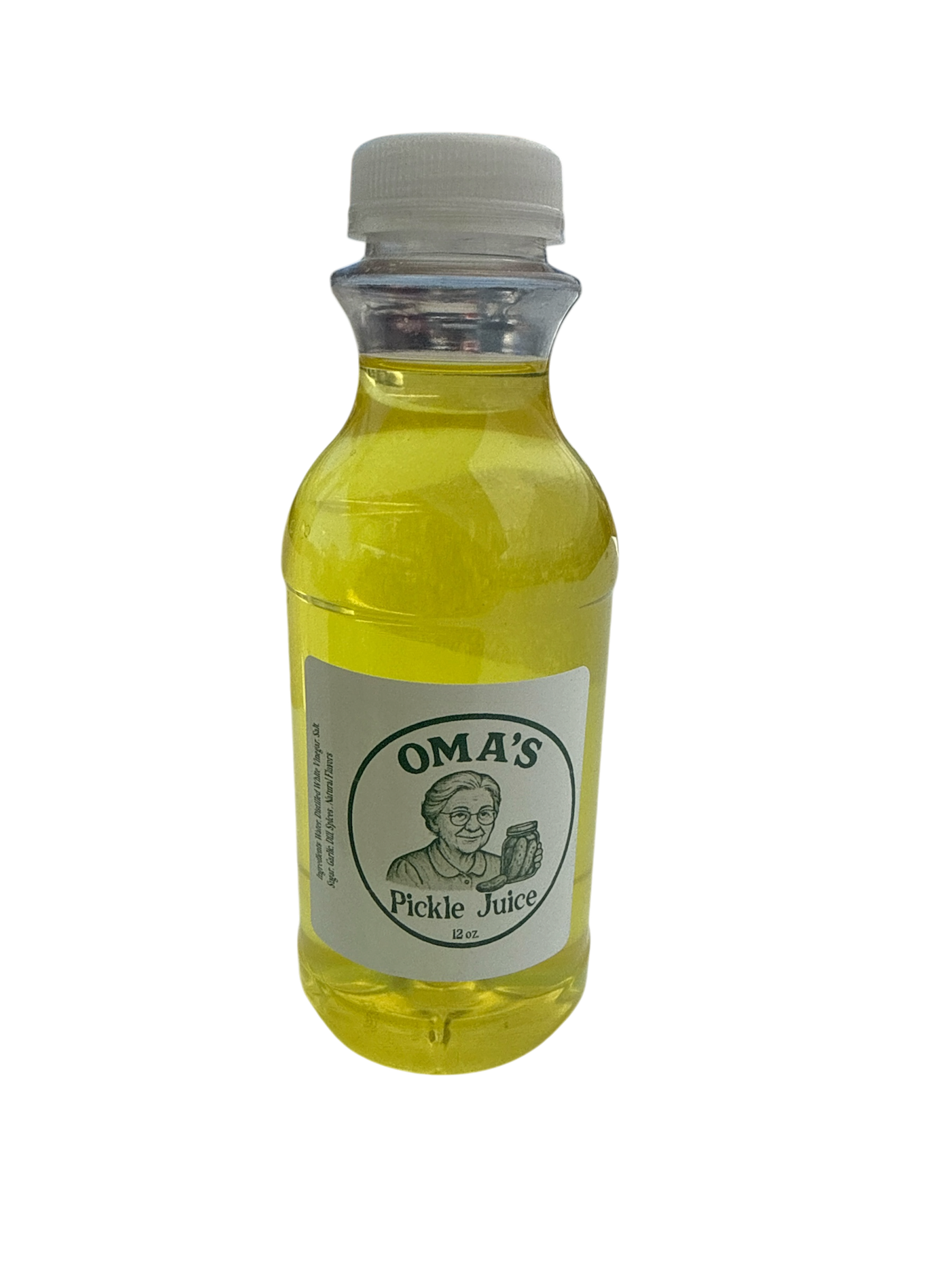 Oma’s famous pickle juice in a larger container. A full 12oz of Oma’s renowned  pickle juice. This is the perfect size for treating muscle spasms and muscle cramps, heartburn or mixing with your favorite summertime beverage for a delicious twist.